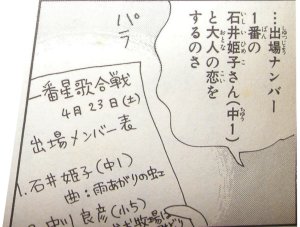 「…出場ナンバー1番の石井姫子さん(中1)と大人の恋をするのさ」